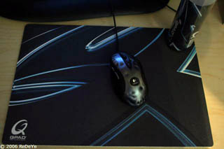 The pad comes in several different flavours, depending on what floats your boat. The review pad is the 4mm thick, Large sized (40.5cm x 28.5cm) black version, however the pad also comes in a very nice looking white (with the same design) and in a more regular sized (medium) 33x25.5cm in either colour. You can also choose the top layer surface, according to QPAD, being either hard or soft topped, but I could find no mention of this on the label of the review pad or indeed, work out which version I had been given. It felt reasonably soft to me though, so I will stick with that. The back of the pad is a coarse white rubber which held itself to my desktop surface without, as you would expect from a top gaming pad, any slippage.