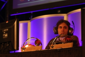 In the middle of all of this, once we were done with CTF broadcasting, Jehar devoted himself to BYOC coverage. He and one of our newest staff members, SquareHimself, had been looking forward to covering the QuakeWorld, Quake2 and the Warsow tournaments. Sadly, due to the reconfiguring of the LAN the night before, our comfy, awesome booth setup was unable to reach the BYOC network. Exhausted but dedicated and resolute, these guys gathered Slava, unplugged the setup in our booth and carted it off to the BYOC area itself. The only space available was literally inside the Network Operations Center, so they quickly setup and covered the finals of the QW, Q2 and Warsow tournaments. Addressing LiveOnThree Episode 56