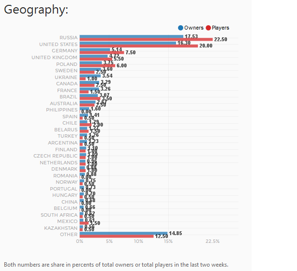 Now it is time to revise those numbers and compare them to the current data but this time from the steamspy website. Steamspy uses the basis of Steam Gauge but the stats are updated daily and there are some interesting features like YouTube and Twitch views, concurrent pla