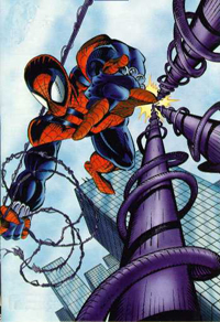 History: Orphaned when his parents were killed in a plane crash, Peter Parker went to live with his Uncle Ben and Aunt May. Although extremely bright, his shyness and studious nature often caused him to be branded a social outcast. Ironically, just such a scholastic pursuit made possible Peter's transformation into a wall-crawling, web-slinging extrovert. During a public exhibition on radiation, an irradiated arachnid fell on his hand, bit him and died. Peter left the demonstration in pain; soon he began to manifest strange, spider-like abilities. Rather than put his talents to just use, the teenager followed a path dictated by his late 20th-century upbringing: He created a costume and capitalized on his newfound powers to pursue TV stardom as the Amazing Spider-Man.