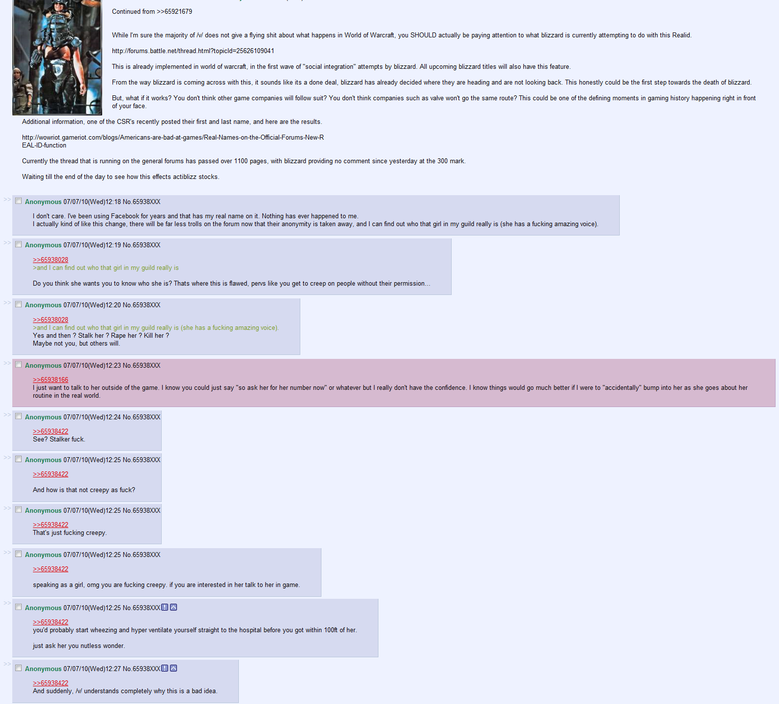 "Recently, Blizzard Entertainment implemented a Real ID feature for some of its current games and all of its future Battle.net-based games. Today, Blizzard announced that it intends to require usage of the real names of Battle.net posters for its StarCraft II forums before release, and for its World of Warcraft forums shortly before the release of World of Warcraft: Cataclysm. From the announcement: 'The first and most significant change is that in the near future, anyone posting or replying to a post on official Blizzard forums will be doing so using their Real ID — that is, their real-life first and last name — with the option to also display the name of their primary in-game character alongside it. These changes will go into effect on all StarCraft II forums with the launch of the new community site prior to the July 27 release of the game, with the World of Warcraft site and forums following suit near the launch of Cataclysm. Certain classic forums, including the classic Battle.net forums, will remain unchanged.'"