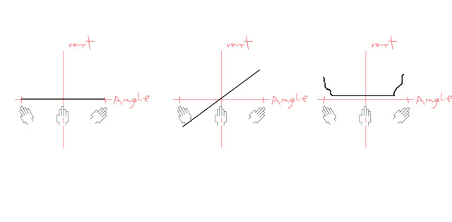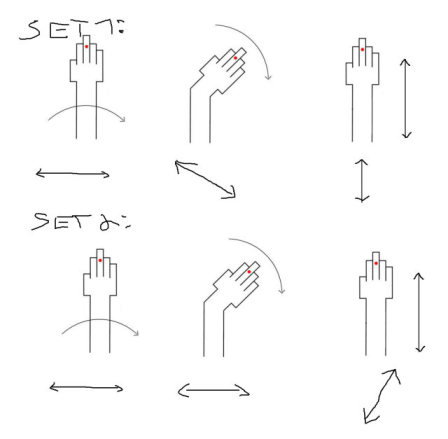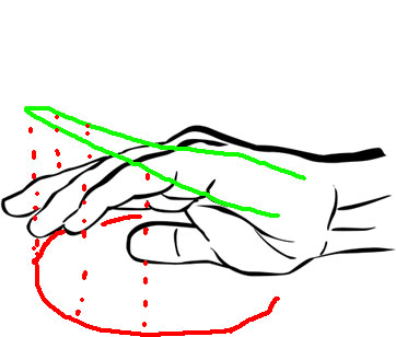 The green line is supposed to be a circle; remember that wrist rotaion should move the sensor in a curve witch is a circle. If you crawl fingers you will lift your hand/knuckels and thus move the circle out of the table plane. The way the sensor follows is now shown as red. Its not a perfect circle anymore but an ellipsoid (witch is a circle projected on a plane) resulting in awkwardly unintended transmission.