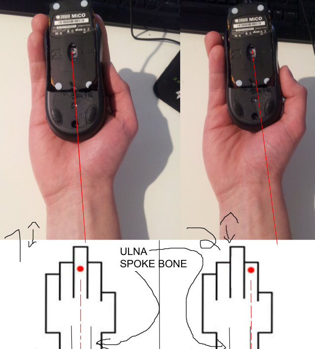 Alignment as shown in pic 2 is the right one, where the aligning along the spoke bone is shown, allowing perfect sync between all movements. Unfortunately its not so comfortable to hold a mouse like this (i think i have several ideas for new shapes to make it better)