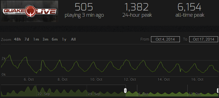 Looking at the excellent graphs provided by Steam, we can note a gentle, but consistent, downward trend. Quake-live on Steam is experiencing a net-loss of a few players every day.