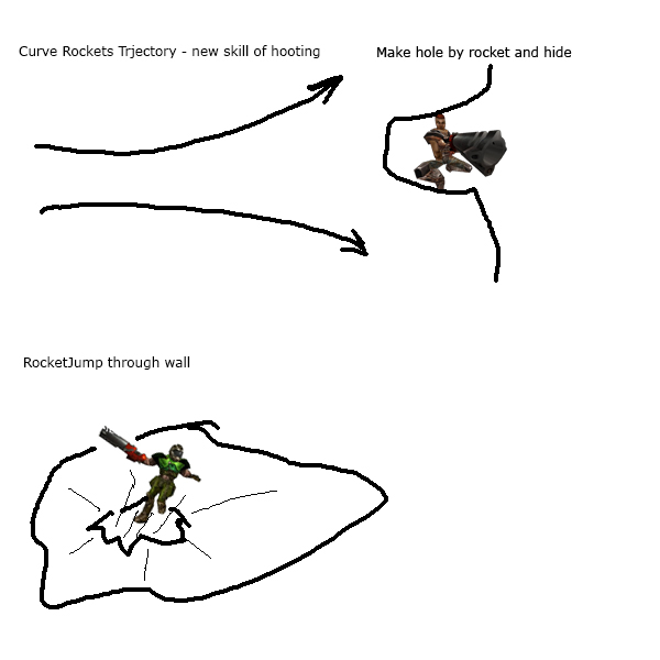-Of course wall demolition.! You rocketJump and crash wall by your body!! Some animation required! =). Also you can make holes by rocket and hide inside!