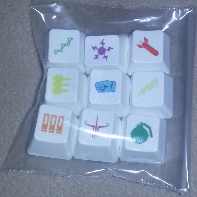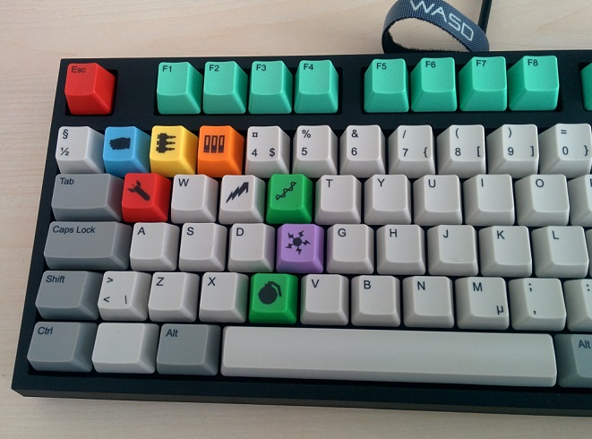 I'm in the process of ordering some cherry mx keycaps with the 8 basic weapons printed on top. You can see the images I've drawn in inkscape here http://imgur.com/NZjBiSp .
