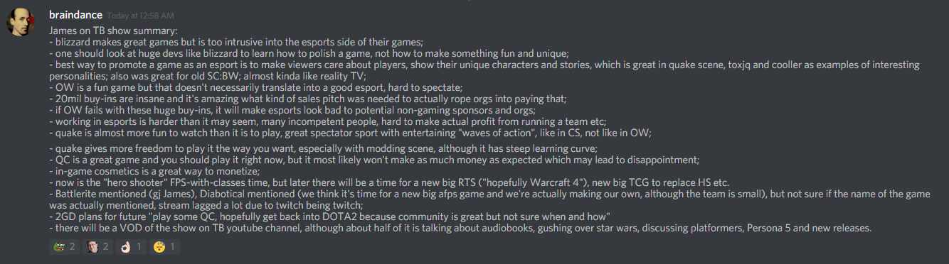I never met 2GD, ofc I saw him many times casting and stuff, but can't say I know him. One thing is clear tho, that he honestly and truly loves Quake like we do, and it's really fun to watch how he talks about it.