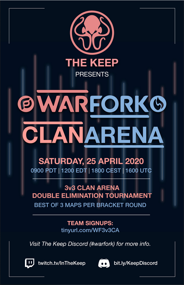 United States of America The Keep are happy to announce the Open Warfork 3v3 Clan Arena Tournament. Taking place on Saturday 25th May at 10:00 CST Come one, come all and test your skill against all players! FIRST COME, FIRST SERVE!