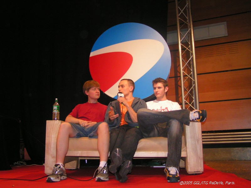 Whever they could, the UT2004 grabbed our GGL stand PC's (as they had no net on their PC's). Here we have Evenflow (white shirt) checking out his pr0n stash, with winz looking on and DevilMC, flanked by dVo.