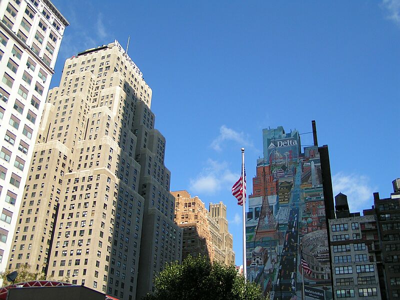 The New yorker Hotel on the left with the dalta airlines commissioned mural on the building to the right. It showed all the destinations they fly to from New York.